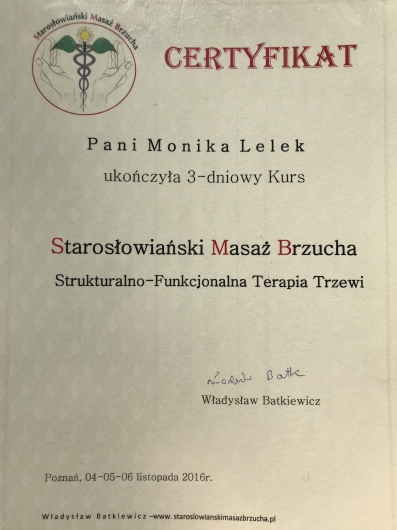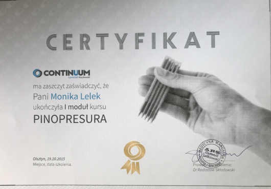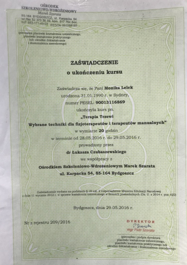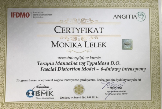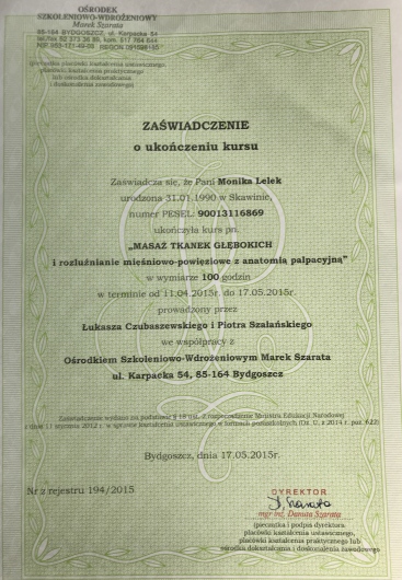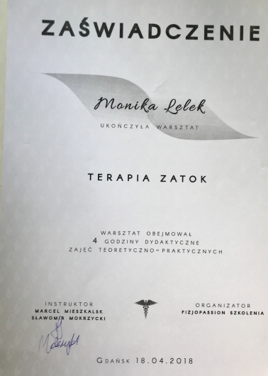 Jestem dyplomowaną osteopatką i fizjoterapeutką, absolwentką Akademii Osteopatii w Krakowie oraz Akademii Wychowania Fizycznego i Sportu w Gdańsku. W swojej praktyce wykorzystuję terapię manualną, której celem jest przywracanie naturalnej ruchomości tkanek, poprawa funkcji organizmu oraz wspieranie jego zdolności do samoregulacji i regeneracji.